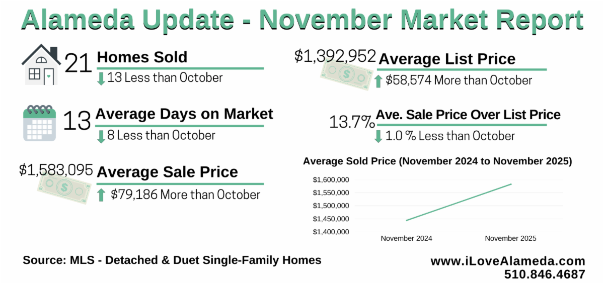 Thanks in part to lower mortgage rates, this year’s selling season has stretched longer than usual, with the true slowdown projected to hit in December. While condos and townhomes continue to attract interest due to their more approachable price points, the Alameda market still overwhelmingly favors single-family detached homes.